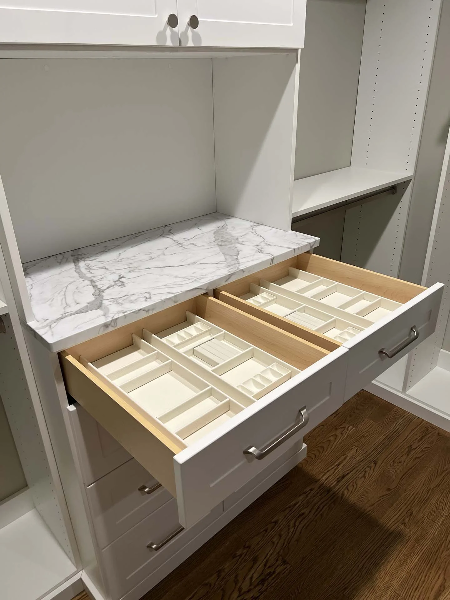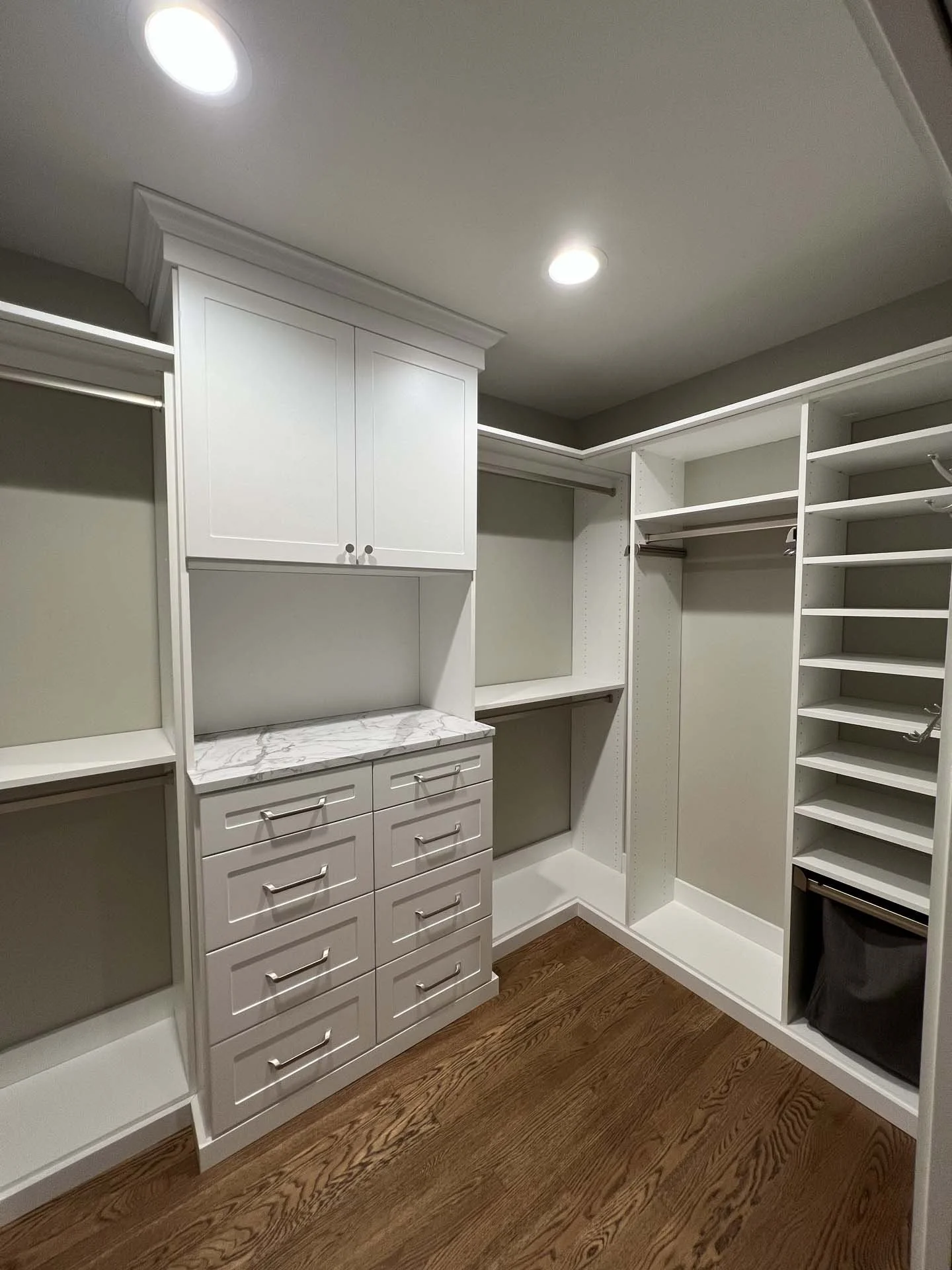 The upgraded closet was designed in classic white with shaker doors and elegant matte nickel hardware and accessories throughout. The central drawer bank adds statement and symmetry to the space with his and her drawers and a Calacutta Warm countertop. Pull-out, soft close accessories add a touch of luxury and tuck away belts, scarves, pants, and hampers nicely. Jewelry is given a place with two custom trays and a cleat board with specialty hooks. Additionally, the continuous top shelf was extended to fit a variety of standard storage bins.