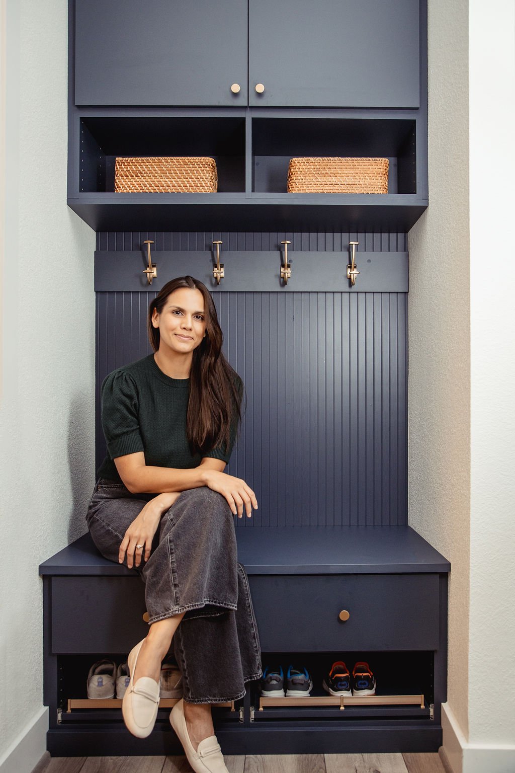 The upgraded mudroom consists of pull-out shoe shelves, drawers, coat hooks and upper cabinets — a complete landing zone for shoes, backpacks, jackets and more. The space is color drenched in Mysterious matte dark blue including beaded panel backing and matte gold hardware.